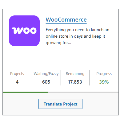 Durante esta etapa identifiqué el proyecto WooCommerce dentro de la plataforma de traducción de WordPress. WooCommerce es un plugin de comercio electrónico para WordPress que permite crear y gestionar tiendas en línea.